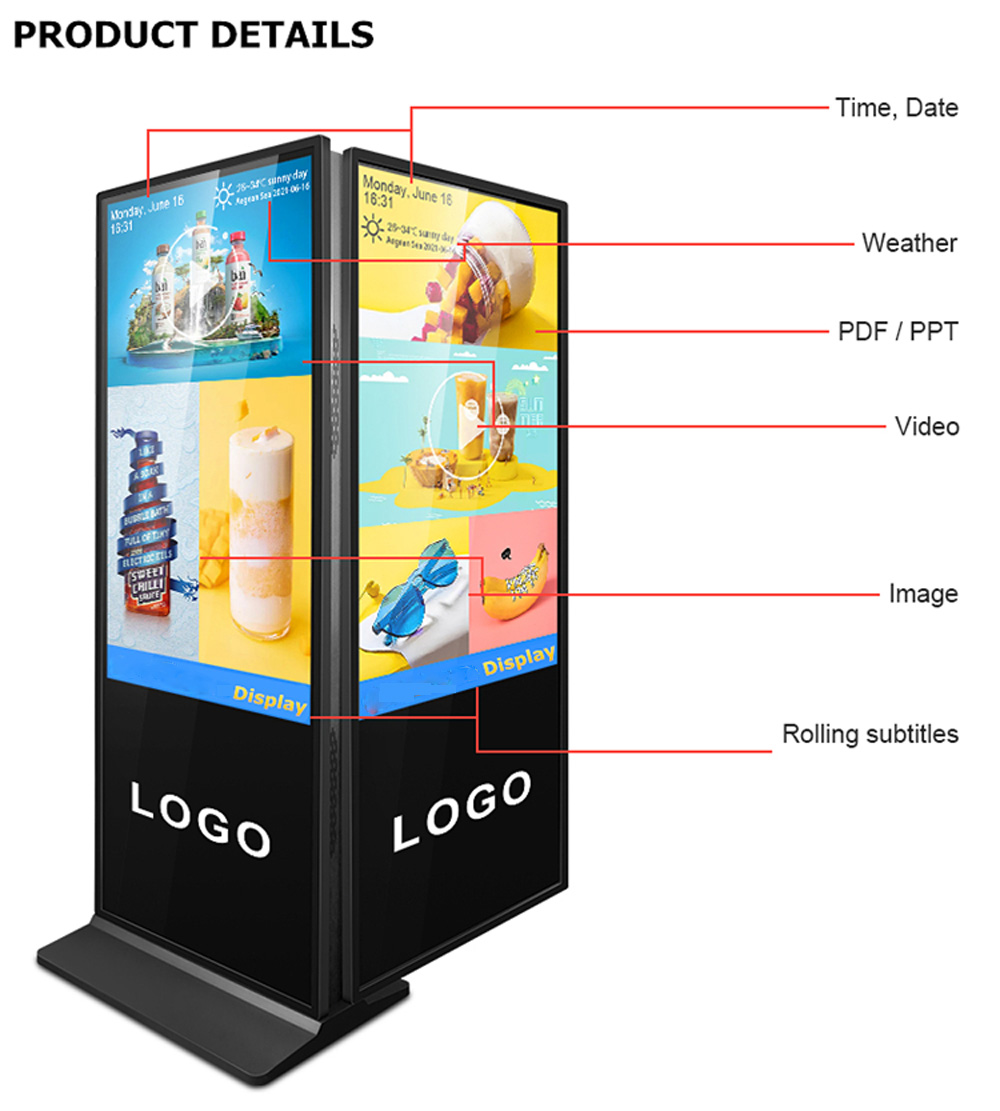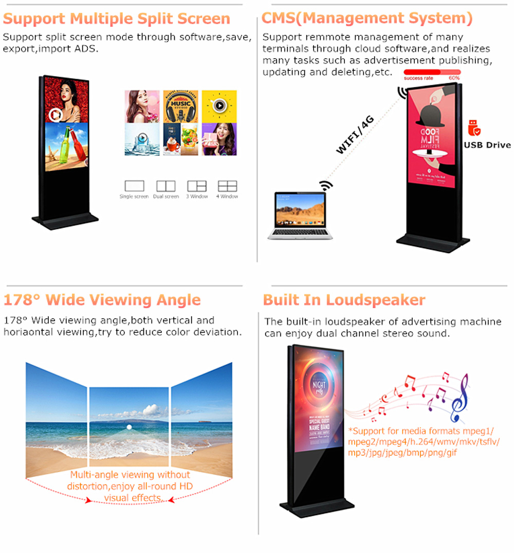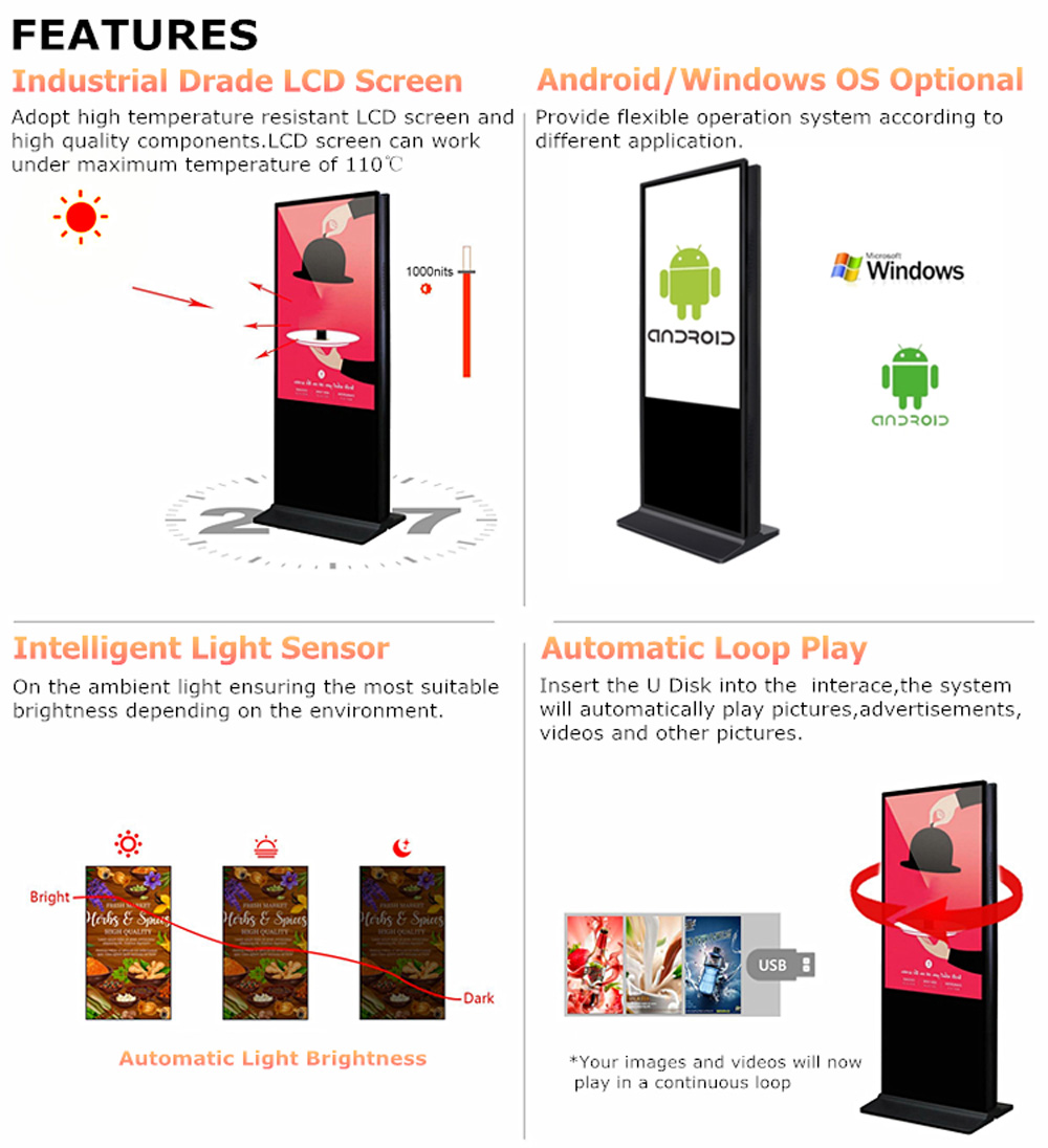 LCD Panel FEATURES:Floor standing series is commercial grade LCD screen technology with Android OS or Windows OS. They are widely used in public environments, including airport, hotel, Bank, Metro station.● Support optional IR touch, Capacitive touch, printer, NFC, camera, etc to meet variety of request from the market.● Support 7*24 Hours long time playback● FHD, Ultra High Definition UHD, 4K different Resolution are optional, Grade A, LED Backlight, Different screen diagonal ,43”, 49”, 55” 65”.● Metal housing have good heat dissipation effect and tempered glass can protect screen effectively.● Supporting connecting WIFI, Ethernet, 4G(option) to achieve different Internet connection access.●Double sided screen Wifi 4G Lcd Advertising Player Free Stand Totem Digital Signage Display interactive Kiosk touch screen●Size: 55/65/75/86 inch●Stytem: Android or Windows●Application: Indoor application. (we also have outdoor for this product)●Touch : 10 points G+F OR G+G (Option not touch)