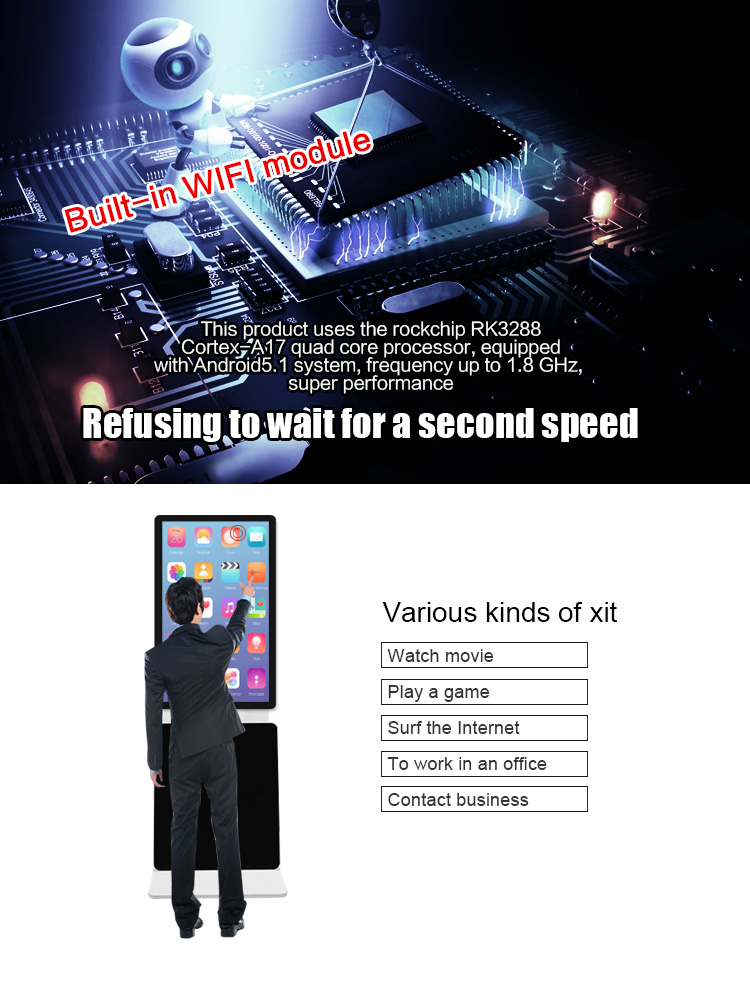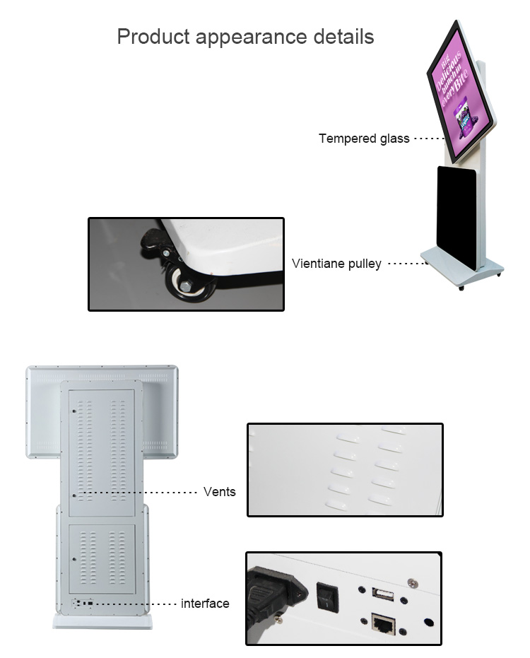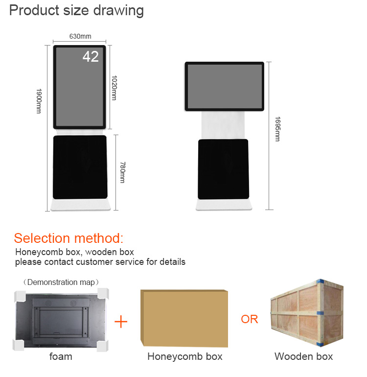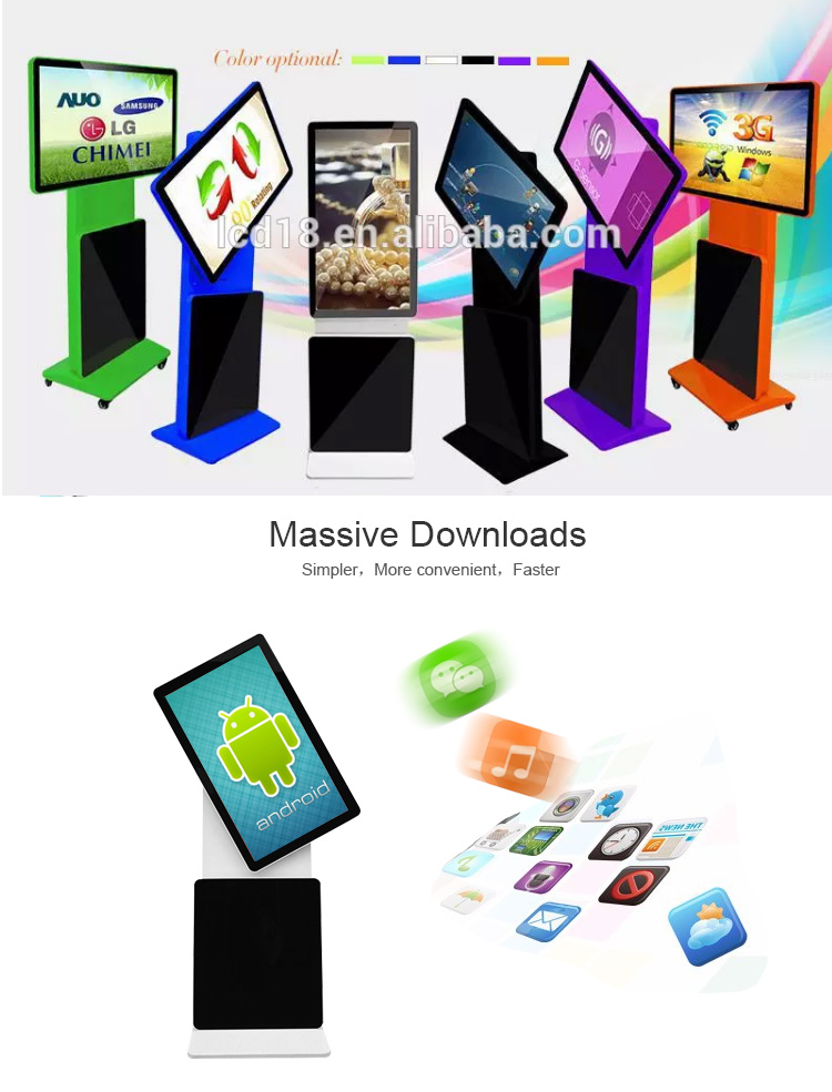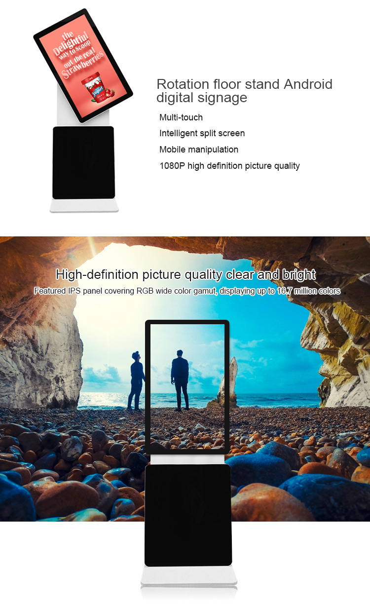 180 degree rotation Floor-standing advertising display (standalone, network, touch screen for optionalFeatures:1. Stylish appearance, full plane, explosion-proof, dustproof, waterproof design;2. HD resolution, the screen has a good visual display effect;3. Support windows, Android system, and the market mainstream operating system;4. Wall-mounted, vertical, horizontal, embedded, desktop, a variety of installation methods;5. Through the information release system, connected to the network, you can remotely manage the advertising machine and directly publish the multimedia advertising information to the advertising machine;6. Free setting, can play various formats of pictures, audio, video and other multimedia materials.