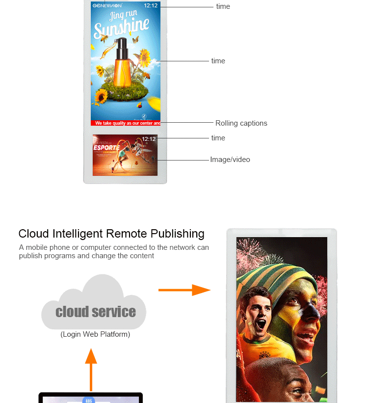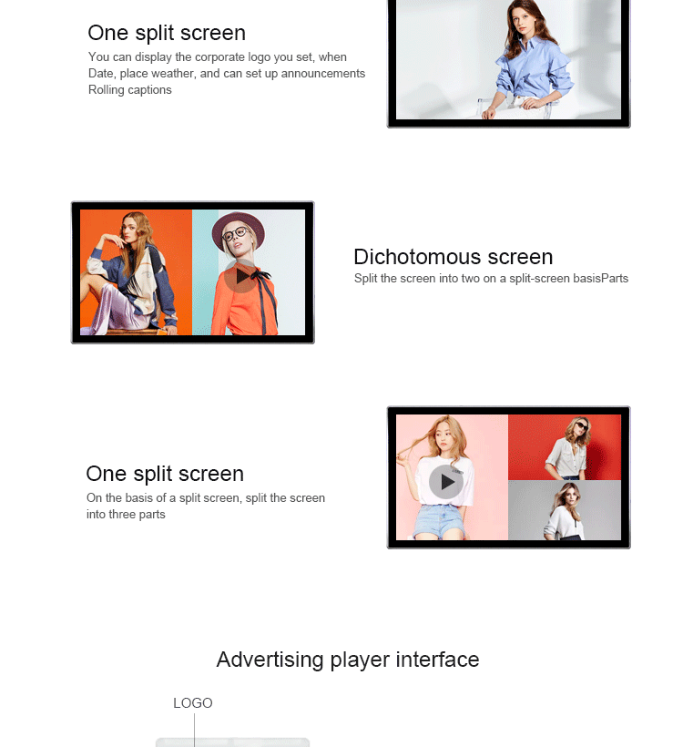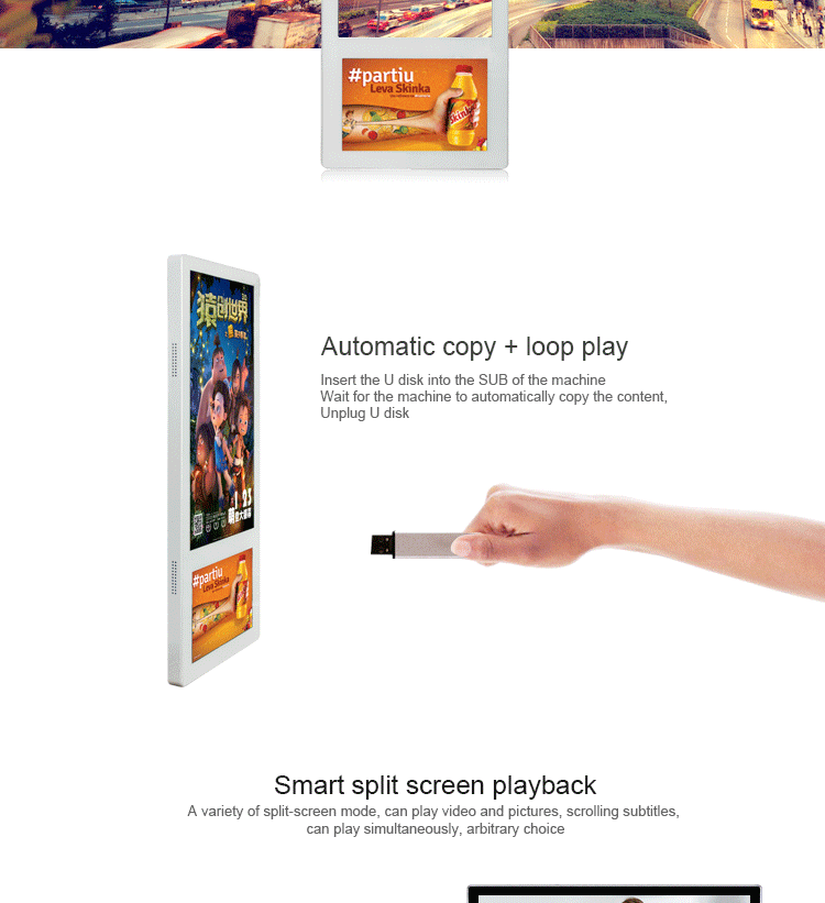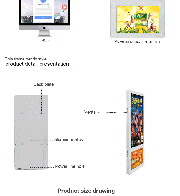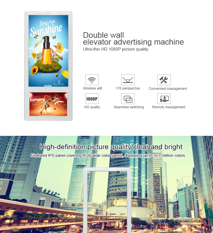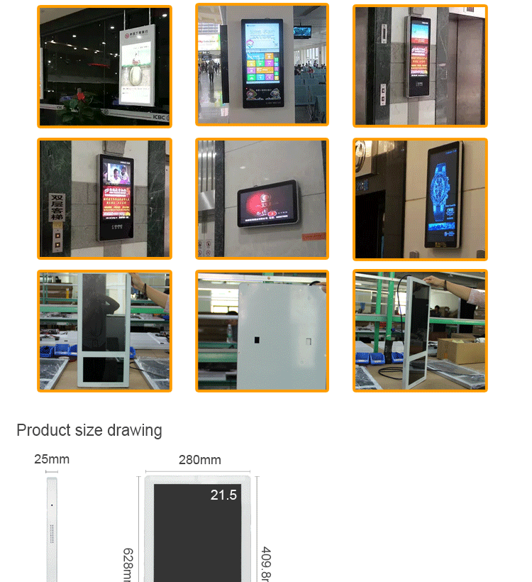Function:1,Playlists support functions, can set different folders, copy all target files to those different folders, system would default to play your target file one by one.2,Capable of setting rolling caption on the screen, playing rolling caption in the advertisement program.3,Build-in clock and calendar function in the system of player.4,Support 5 groups of auto power-on/off timer, able to set those 5 groups of time one day and 7 days in one week.5,Support shockproof and dustproof function.6.For little size like 18.5inch or 24inch, display can be glue on the wall of elevator, easy to install.7.Operation system: standalone, advertising to be updated by USB or SD card, easy to use.8.Android, hundreds terminals‘ advertising to be controlled by remote managing software via internet, has touchscreen and 3G on option.Specification
