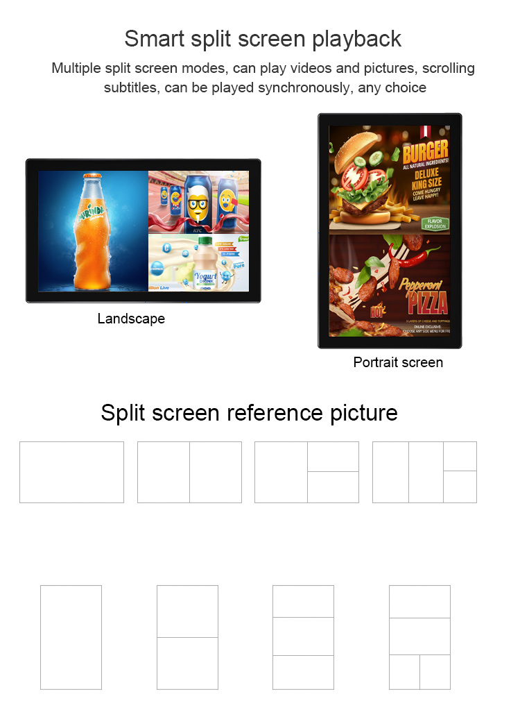 Free split screen; Video, pictures and text are played synchronously; Timing switch; Live broadcast.