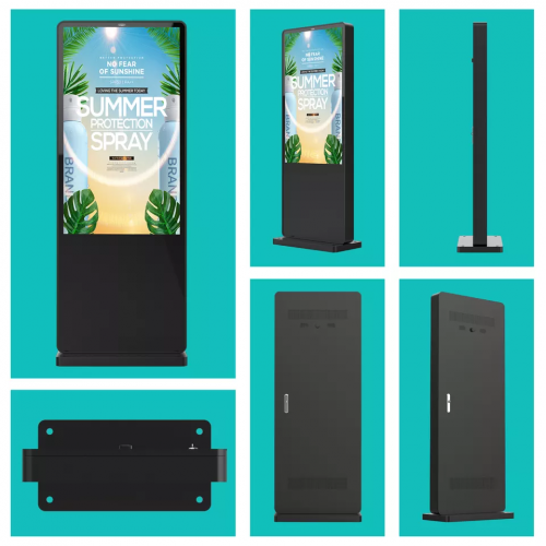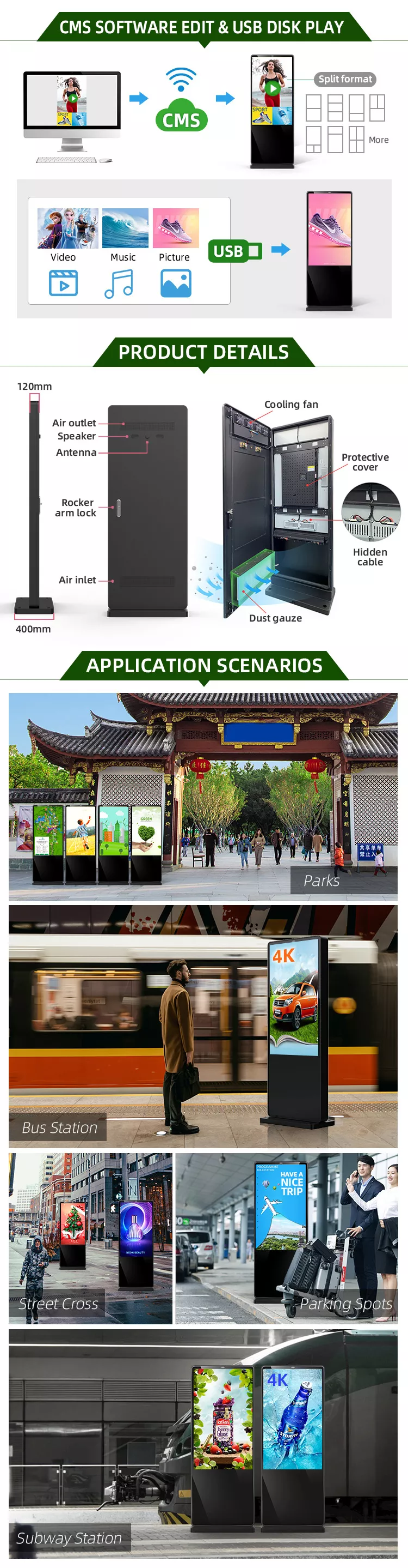 Features of floor stand digital signage outdoor:1.Waterproof, dustproof, anti-corrosion, explosion-proof, anti UV, anti-theft2.Temperature Sensor, Auto-Brightness Sensor, Pixel Sensor, Cooling Fans, Energy Saver Mode, File Play with USB, Internal Memory (8 GB or above), Easy Brightness Control, Content Scheduling, Remote Management, Multi-Language OSD etc.3.shell design: the shell with 1.2 or 1.5mm galvanized plate, outdoor anti-corrosion for more than 7 yearswaterproof design: meet the IP65 protection level.4.anti-theft design: base / racks with internal lock design, to prevent the removal of screws from the outside of the mobile equipment.5.Intelligent photosensitive system: it can automatically adjust the brightness of the screen according to the environment
