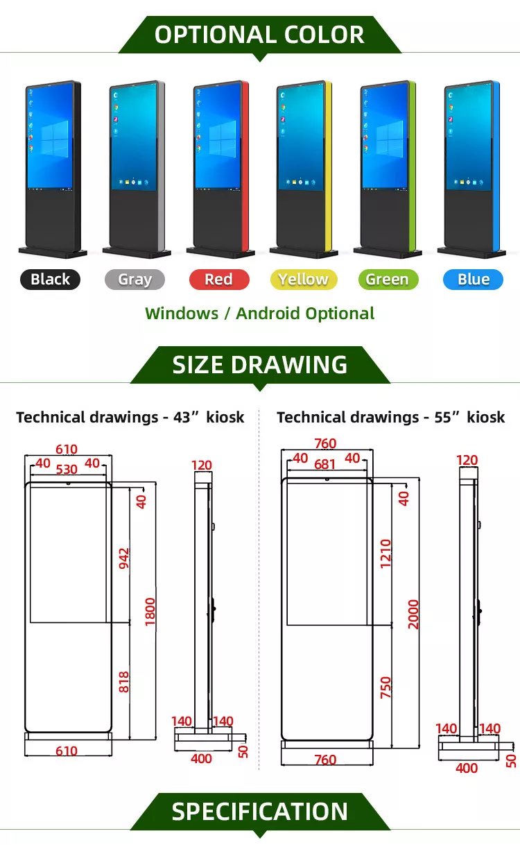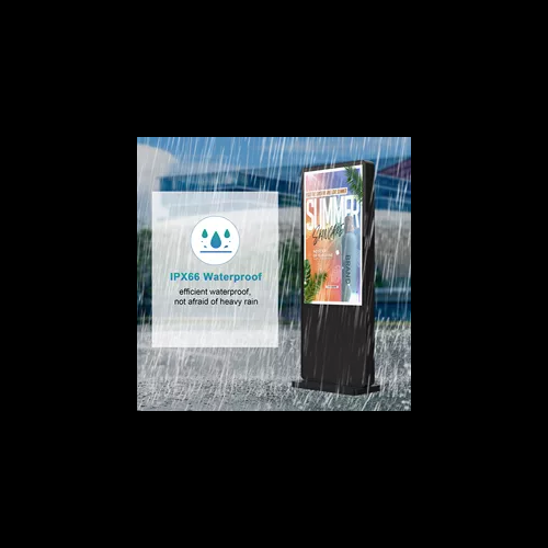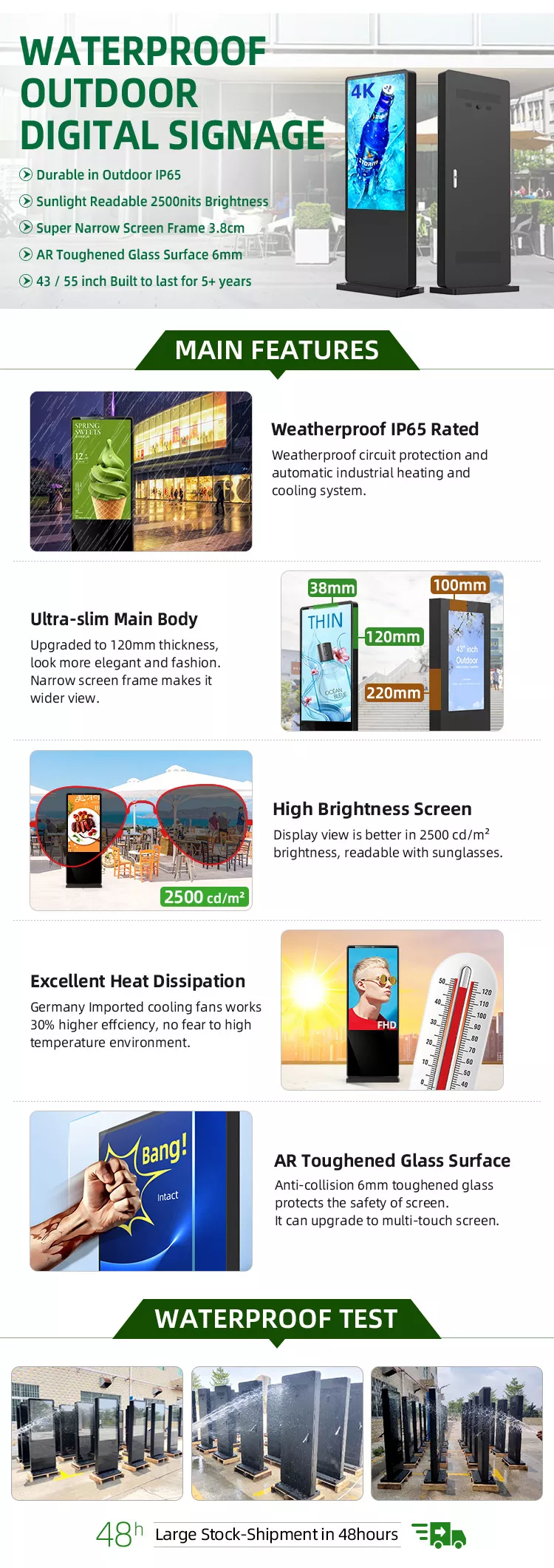 Main FeaturesWaterproof IP65 Rated:Waetherproof circuit protection and automatic industrial heating and cooling system.Ultra-slim Main body:Upgraded to 120mm hickness,look more elegant and fashion.Narrow screen frame makes it wider view.High Brightness Screen:Display view is better in 2500cd brightness,readable with sunglasses.Excellent Heat dissipation:Germany imported coling fans works 30% high temperature environment.AR Toughened Glass Surface:Anti-collision 6mm toughened glass protects the safety of screen.it can upgrade multi-touch screen.Screen sizes43” & 55”