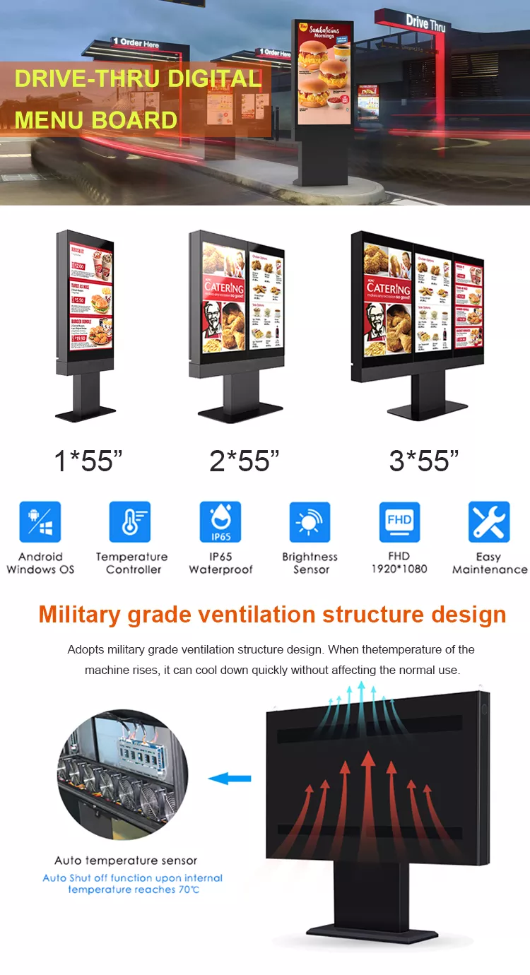 Factory 3x55 inch outdoor IP66 waterproof LCD screen drive thru digital menu board for restaurant