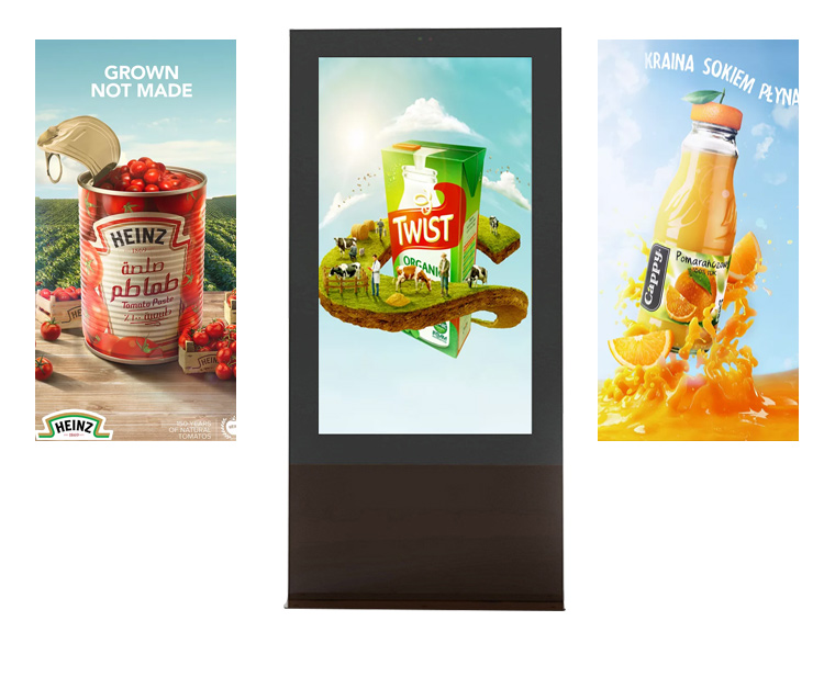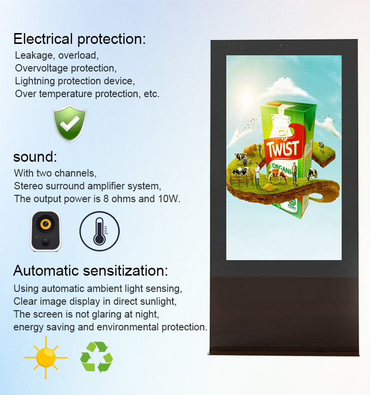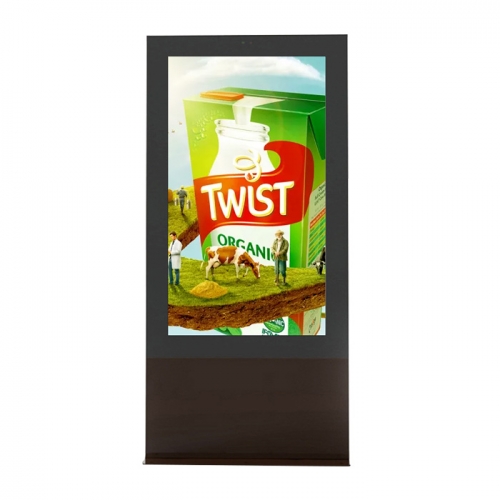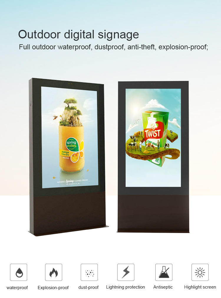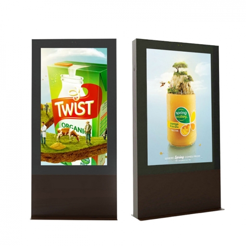 65-inch high brightness 2500cd touch screen outdoor advertising floor stand digital signageDescriptionWidely used in outdoor advertising display, traffic indication, etc.The whole IP55 protection level, dustproof, waterproof, can be fully installed outdoorsSun VisibleWork normally under wide temperature conditionsCan provide remote publishing system, outdoor touch screen solutionsCustomizable design and production42-82inch in stock nowFeaturesFloorstanding mounted, easy to maintainFull outdoor waterproof design, outdoor protection level reaches IP55High-brightness LCD screen with anti-reflection design to achieve sunlight visibilityPatented temperature control, no blackening under direct sunlightIntelligent fan cooling system, the internal temperature of the machine works, the backlight brightness of the LCD display runs for a long time without attenuationSolutions for applications such as outdoor information distribution systems that can be customized for industry use Solution.Product technical characteristics1.The overall outdoor structure achieves IP55 waterproof and dustproof2.Designed with a variety of mounting methods for back-mounting or custom installationHighly transparent glass for improved visibility of the display, AR anti-glare for clearer image quality in the sun3.The metal casing of the galvanized steel plate is matched with outdoor anti-rust powder, and the outdoor anti-corrosion achieves high contrast for more than 7 years4.High-brightness LCD screen with brightness up to 2000cd/m25.backlight is used, the life span reaches 100,000 hours, environmental protection and energy saving6.High dynamic contrast and clearer display7.Accurate temperature control combined with heat dissipation scheme, display 7*24 hours working brightness without attenuation8.1920*1080 Display resolution up to 1920*1080Temperature control system1.Precision intelligent direct ventilation system to ensure the best working environment for internal electronic components2.Patented thermal design ensures no blackening of the LCD screen in an outdoor-35-+55 degree environment3.Independent research and development environment control board, built-in fan speed control, speed and temperature display, heating functionProduct Specifications: