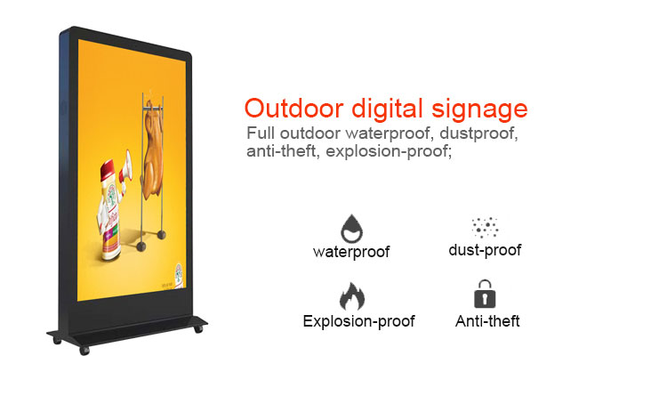 Display ratio16:9Resolution1920x1080Viewing angle178°/178°(H/V)Color16.7MBacklitsLEDBrightness1000-4000 cd/m2(Automatic adjustment)ComputerCPURK3288(For others please contact us)RAM2GStorage8GOperation systemAndroid(For Windows please contact us)NetworkRJ45, WIFI,4G(For option)InterfaceVGA/USB/HDM/IPowerValtage InputAC100-240V, 50/60HzEnclosureMaterialGalvanized steel or Stainless steelColourBlack, White, Silver or customizedGlassTempered glassIP ratingIP55/IP65Working ambientTemperature-25°C- 65°CHumidity0-95Cooling systemCooling systemAutomatic Air cooling, A/CPackingMaterialPlywood/Flight caseDescription:Our outdoor LCD digital signage and displays is not afraid of hash environment as it‘s waterproof and dustproof, with highbrightness of 2000nits and can be readable in the sunlight, has Air-conditioner inside for heat release, with tempered glass in front which also can be vandal resistant design, system can be Android or Windows or standalone type which is USB plug and play, if with Android motherboard, CMS can be provided as well, also support Google play store, end user can use their own software. Support all day running which is 7*24*365day working, power on and off time can be set in the system. Built in speakers is standard spec for all our lcd digital signage and displays.