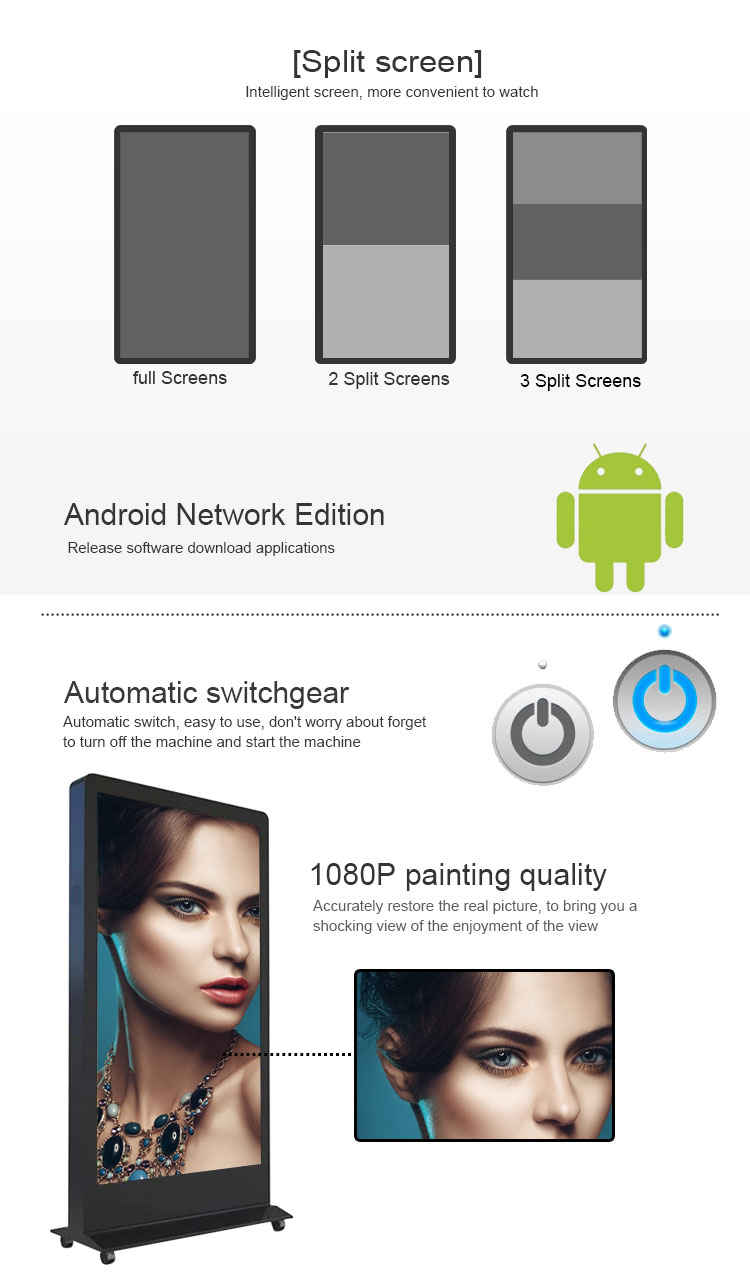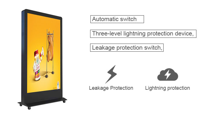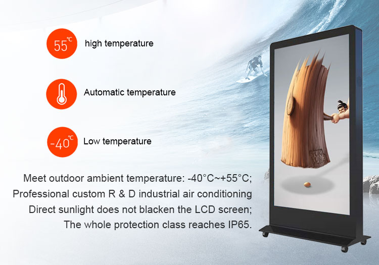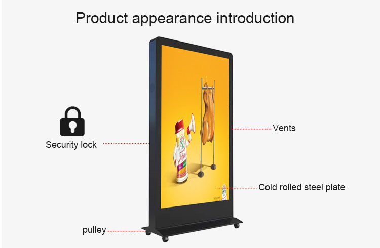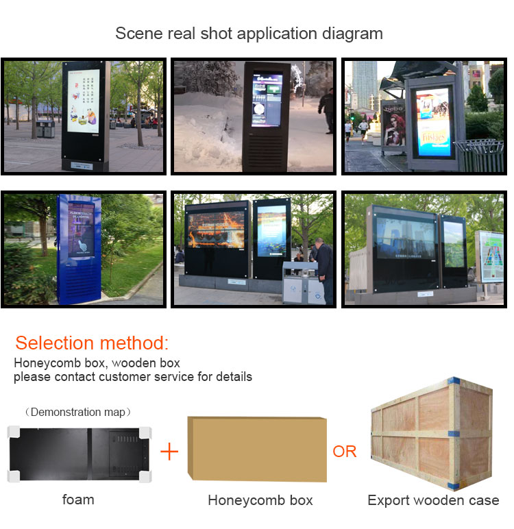 Product Features1 . Long lasting brightnessThanks to the high-efficiency LED back light panel uses on outdoor series products, 24 x 7 is easily to be achieved; besides, the monitor is also excellently viewable from even very large angle and strong sunlight, you can always feel the great contrast ratio and colour saturation that the screen brought you.2 . Fully outdoor protectionOutdoor series products can be used totally outdoor, no matter how extreme the weather changes, the strong metal casing & tempered glass covered kiosks will always keep your information advertising.3 . Temperature & humidity controlEmbedded heater, fans & sensors are working together to keep the whole unit operates in well condition, continuously advertising in anywhere of the world.4 . Automatic brightness controlThe brightness is automatically adjusted according to various sunlight environments, night mode(lowest brightness) will be activated in the night, the highest brightness will be turned on during the noon with strong sunlight.ItemSpecification DescriptionScreenPanelFull New 100% A+ Grade Brand/LG/BOEPanel size32" 43" 49" 55" 65" 75" 86" 98" 100"
