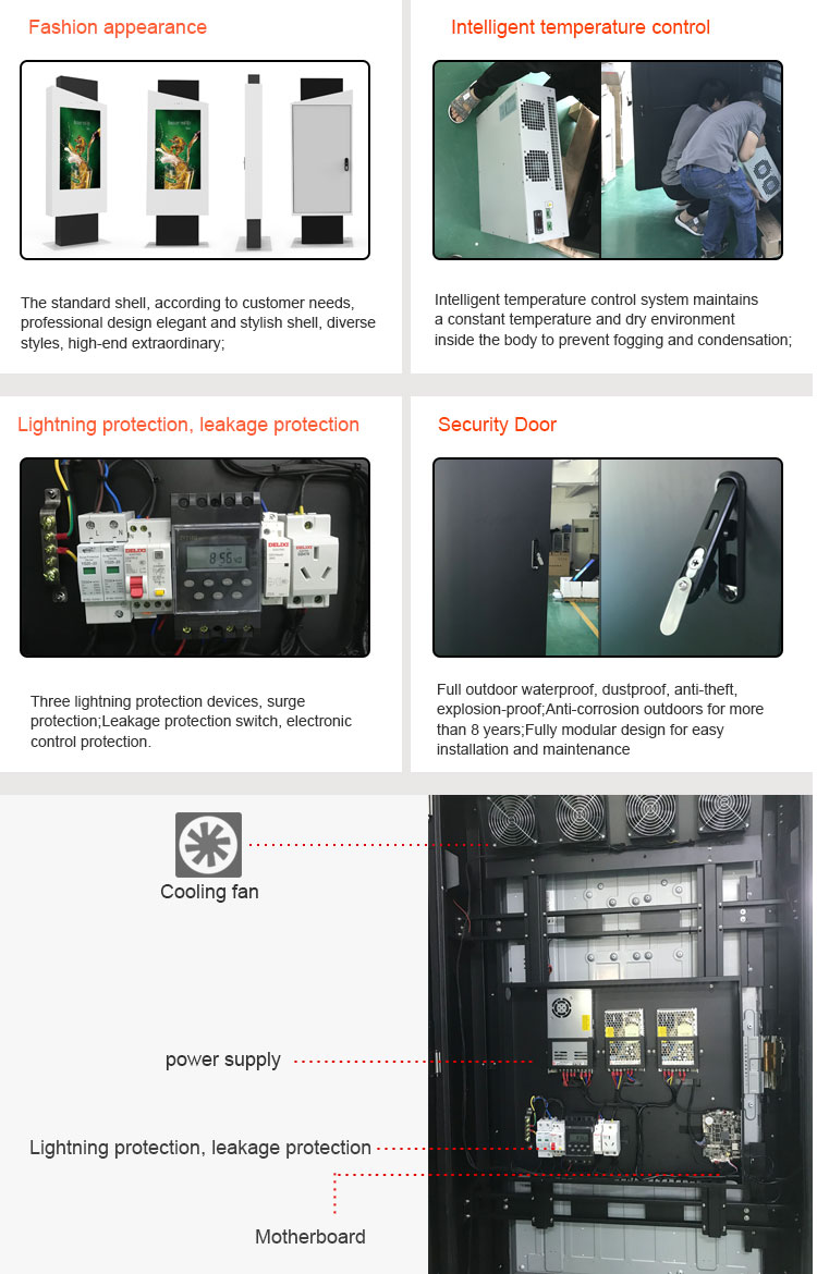 Quick details:1. 86inch 4K 3840*2160 UHD resolution2. IP65 waterproof grade3. Touch screen for information checking station4. Sunlight readable outside5. Air-conditoner inbuilt to keep the same temperature inside6. Anti lighting and thunder protection technology design7. Anti-rust galvanized steel with outdoor kiosk powder painting8. Customized super thin design and bright color9. Customized landscape displaying direction