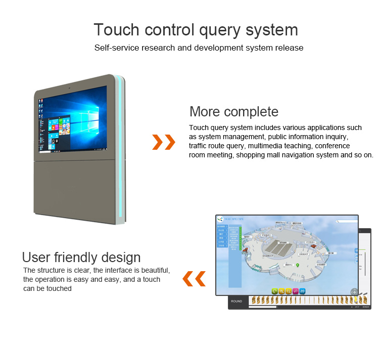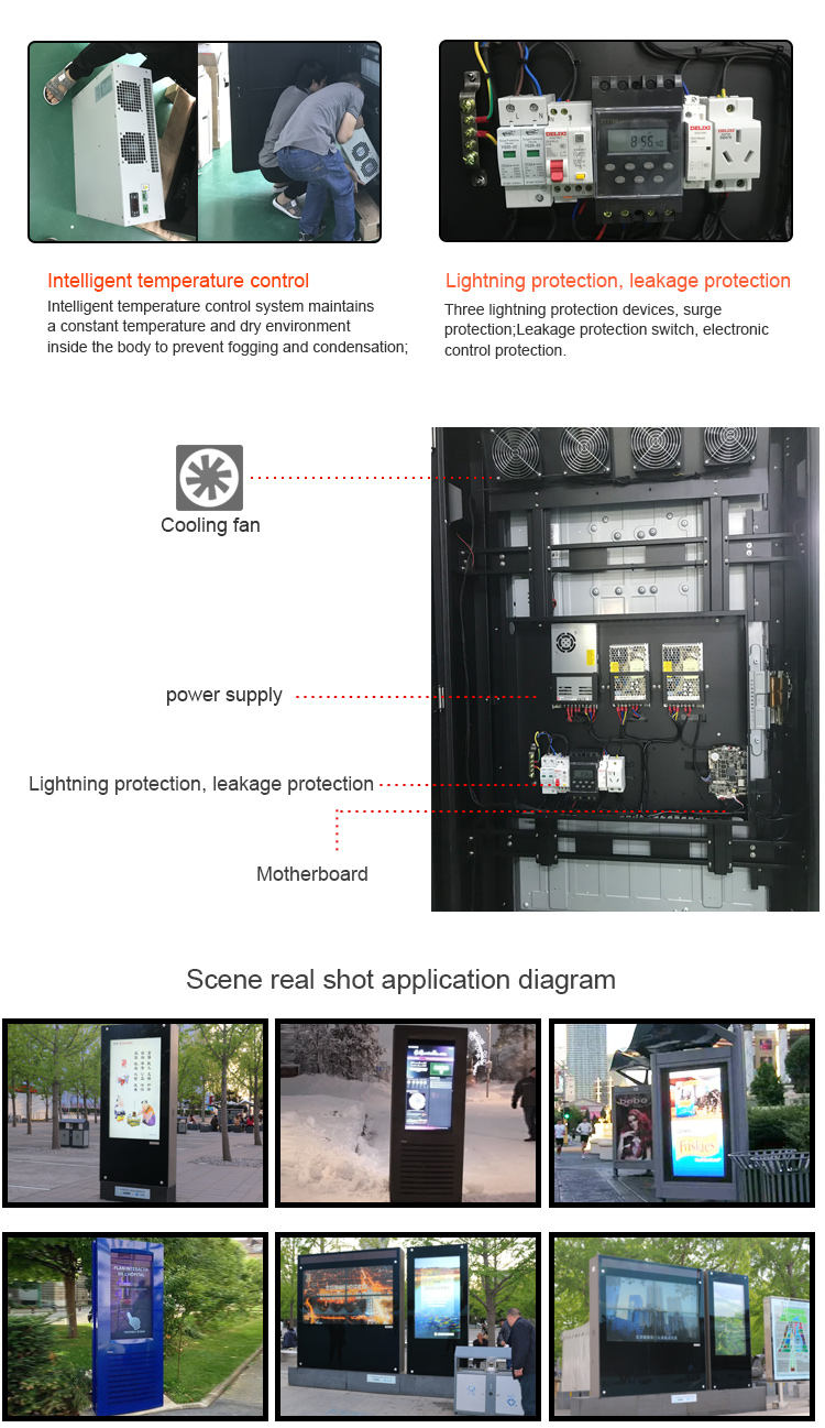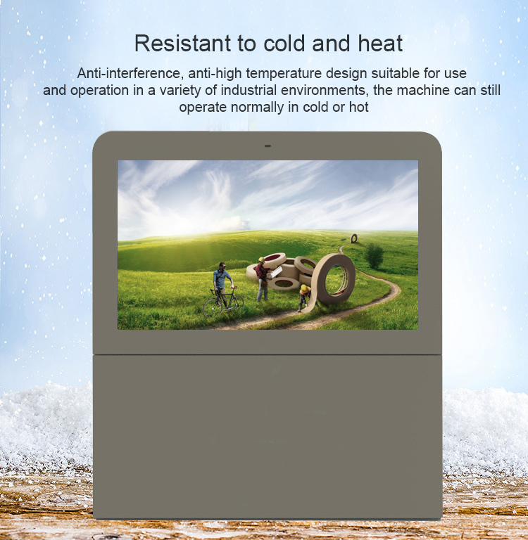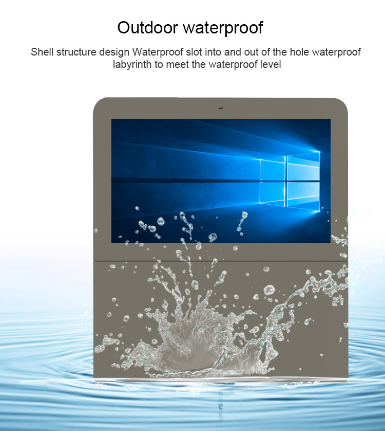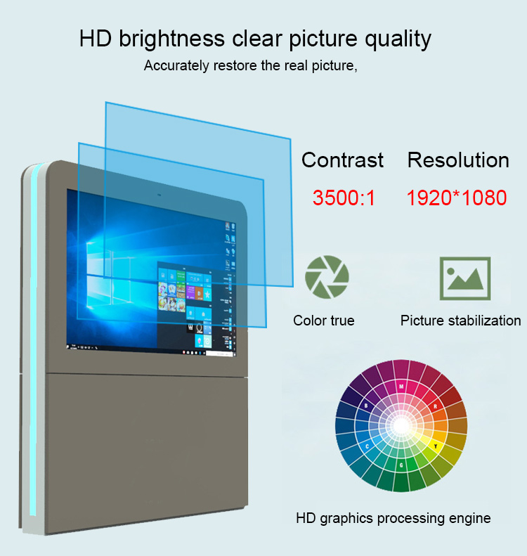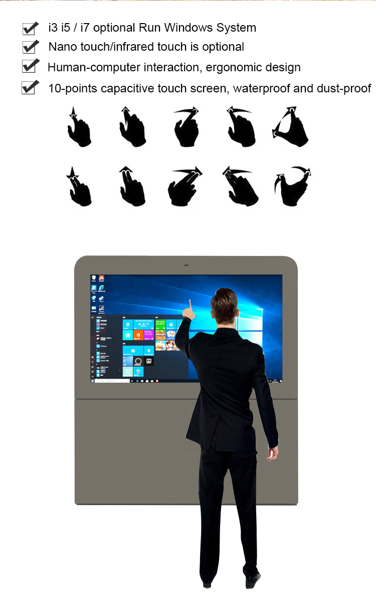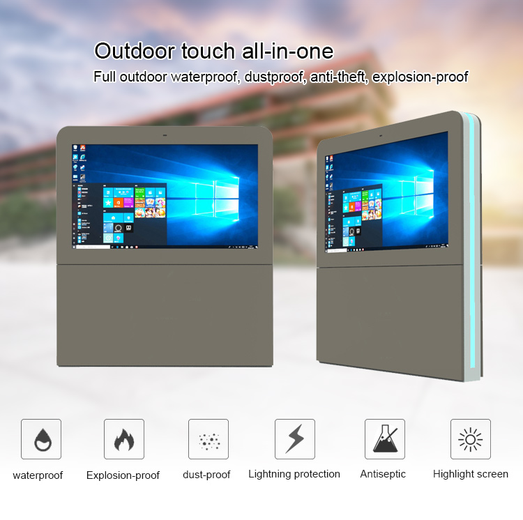 Horizontal Outdoor sunlight readable 43/55/65/75 Touch All in One PC Windows OS IP66 lcd standing totem screenAnti-Reflective Ultra Bright Screen. Customers can be confident that in any type of weather condition, day or night content will be visible. Temperature regulated case to ensure the screen does not over heat or will not freeze. With its sleek design and color options of black, this kiosk is a standout in any location. Built-In Media Player included.Panel Type A+ TFT-LCD IPS Panel 55 inchView Area 1209.6×680.4mm(W*H)Show Ratio 16:9Backlight Patented LED module + Constant power componentsShow Color 16.7M 68% (CIE1931)Brightness 2000 - 3000 nits Sun-readableContrast Ratio ≥4000:1Visual Angle 178°(H) / 178°(V)Response Time ≤5msS-System PAL / NTSC / SECAMLife Expectance 60000 HoursPlay mode Circulation, timing, inter-cutting etc.Network Ethernet, wifi, 3G, 4G is optionalVideo format wmv, avi, flv, rm, rmvb, mpeg, ts, mp4 etc.Picture format BMP, JPEG, PNG, GIF etcNetwork Protocol TCP IP/PPPOE/ICMP/DHCP/DNS/FTP/HTTPOperation System Linux, Android, WindowsEnclosure cold-rolling metal plate + Specialized outdoor paintWhole Color Silver / Grey / White / Black or CustomizedHeat Control Industrial Fan-cooling / Air-conditioningProtective Glass 6/8 mm AR-laminated tempered glassProtective Level Fan-cooling≤IP55 /Air-conditioning≥IP65Speaker 2*10W StereoControl Interface USB, SD Card, HDMI, VGA, DVI, RJ-45, WIFI, 3GSupport Project Player Alone, Network, Touch ScreenDimension 1409.6x880.4x220 mm (Customized)N.W / G.W 122KG /148 KGAccessories Remote Control, AC Power Cord, Key, Rack, Instruction, Approval Certificate,Warranty CardWork Temp -30℃ to 55℃Storage Temp -35℃ to 60℃Work Humidity 10% to 90%Storage Humidity 10% to 90%Power Voltage AC100V-240V (50/60Hz)Consumption ≤ 700WStandby ≤3W