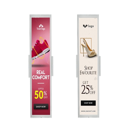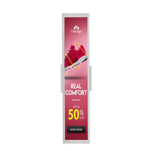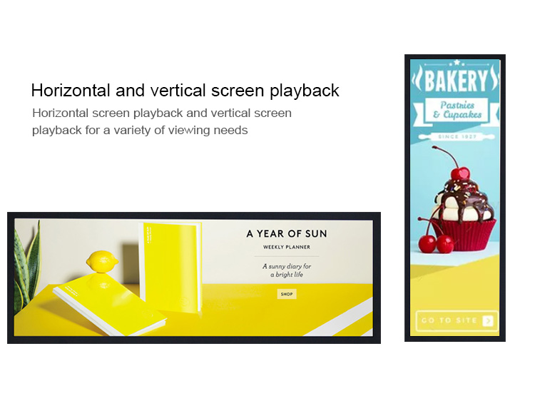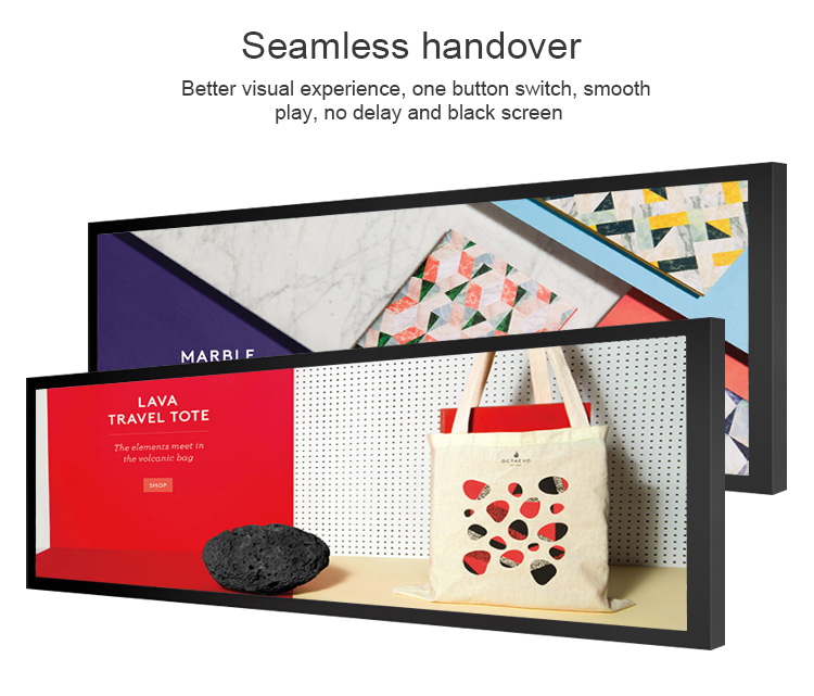 Stretched bar LCD display design for bus/metro,airport and other transportation,Shopping mall and retail shop, replacement of the traditional paper display.● High contrast, high brightness, greatly improving the layering of the picture, and better performance of details;Wide color range.● Sync play or Play as a video wall.● Shelf edge LCD display with narrow bezel, advertisements are displayed without blocking the sight of consumers.● Support WIFI/LAN,3G/4G(optional).Optional Refee CMS software for content remote management