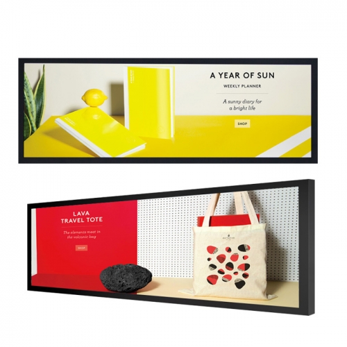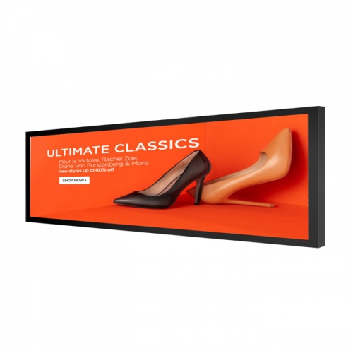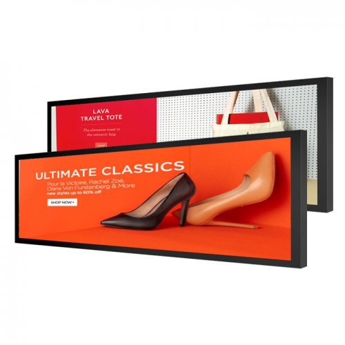 Bar lcd display 23.1‘‘ 28‘‘ 37.2‘‘ 48‘‘ 58‘‘Full HD 1920*158 (23.1”) and HD 1366*200 (16.1”)USB card display Video & image contents playing or Android wifi with software remotely publish advs.Ultra-slim bezel Easy CMS operation,Multi-device management via Cloud,Supports Android wifi OS or Windows OS,Comprehensive display management with our instore digital signage